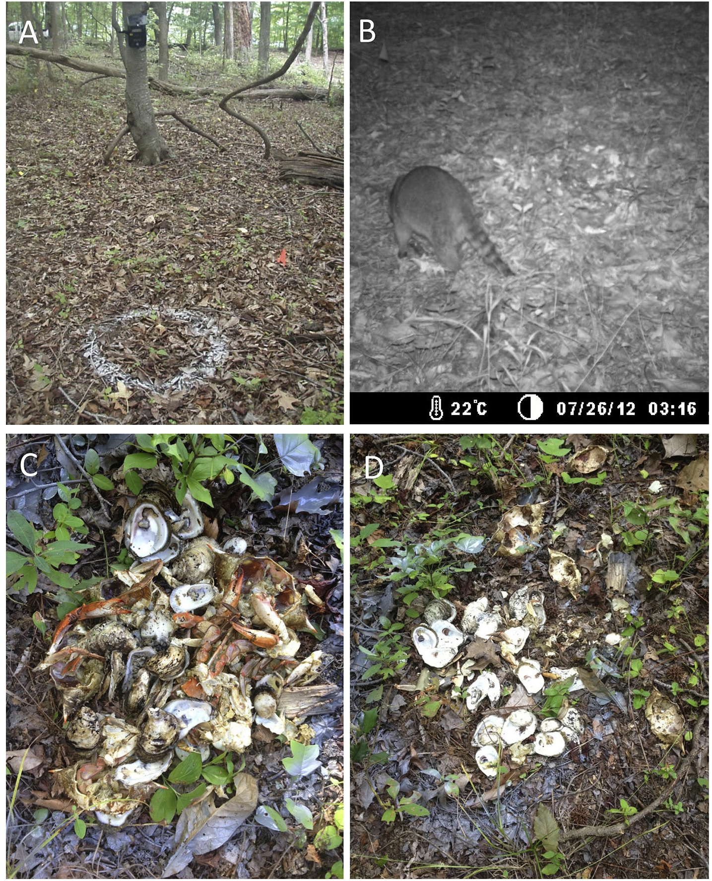 Рис. 1. Экспериментальная археология отвечает на вопрос, почему в захоронениях так мало остатков крабов, но много устриц. А - камера расположена на дереве, так чтобы фиксировать движение внутри круга, B - первой же ночью камера зафиксировала появление енота, С - как выглядит приманка до енота, D - а так после, из Rick et al., 2015.