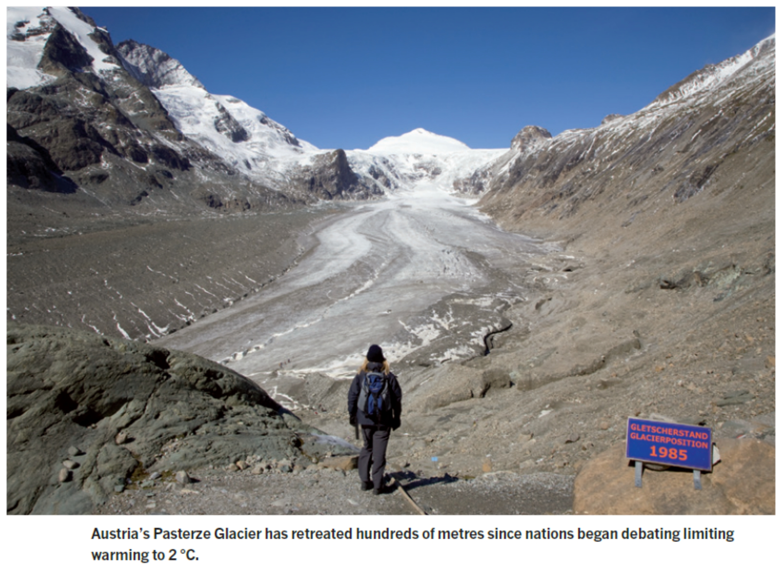 Рис. 1. Табличка поставлена около границы ледника в 1985 году, когда впервые встал вопрос о последствиях потепления на два градуса. Ученые предсказали, что ледники начнут таять, что и произошло, из Tollefson, 2015.