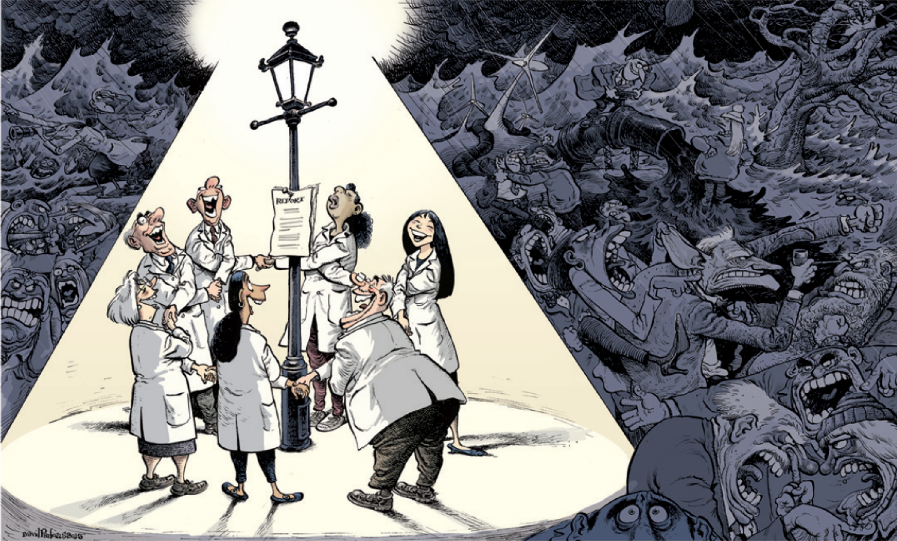 Рис. 2. Карикатура о роли представителей науки в бурных общественных дебатах нашего времени, из Victor, 2015.