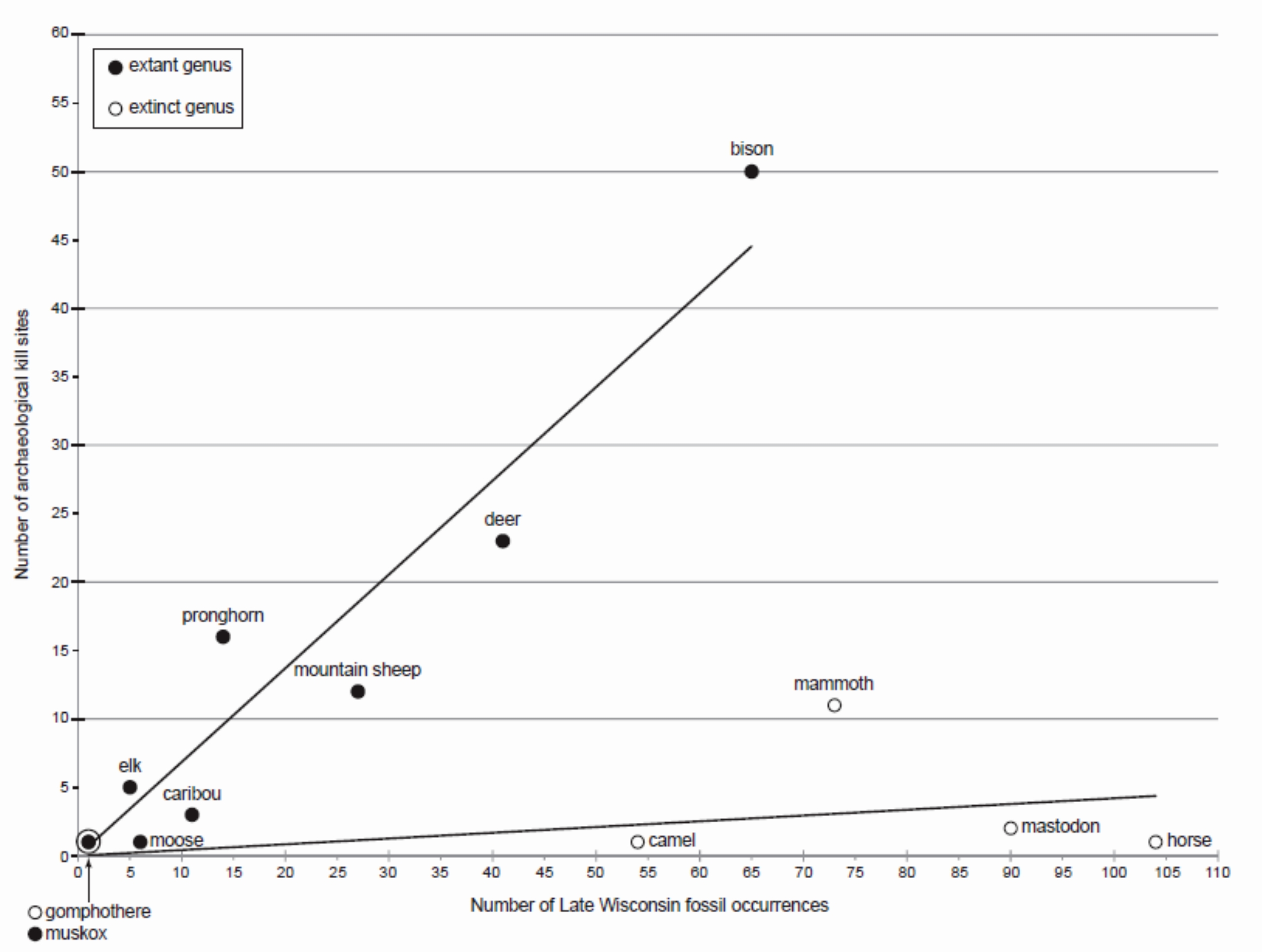 Люди пересекались с вымершими животными пяти родов, чаще всего они имели дело с мамонтом - 11 стоянок, и редко с мастодонтом - 2 стоянки, слоном рода Cuvieronius (Кювьерониус), лошадью и верблюдом – по 1 стоянке. Но еще чаще, люди охотились на животных, которые живут до сих пор, таких как бизон, олень и вилорогая антилопа (рис. 1). Получается, что те, на кого охотились, те и сумели выжить. Похоже, что древние люди не обладали абсолютным оружием, способным подорвать здоровую популяцию диких животных. Охота велась с целью добычи пропитания, а не из спортивного интереса, она была сопряжена с трудностями и большой затратой энергии.